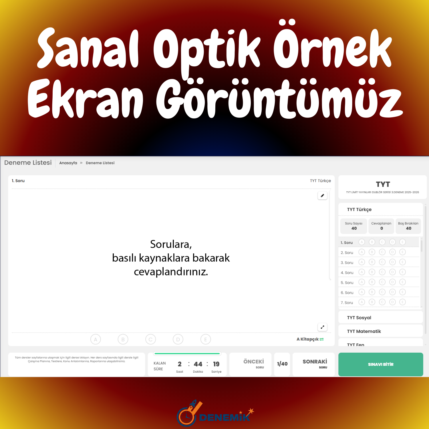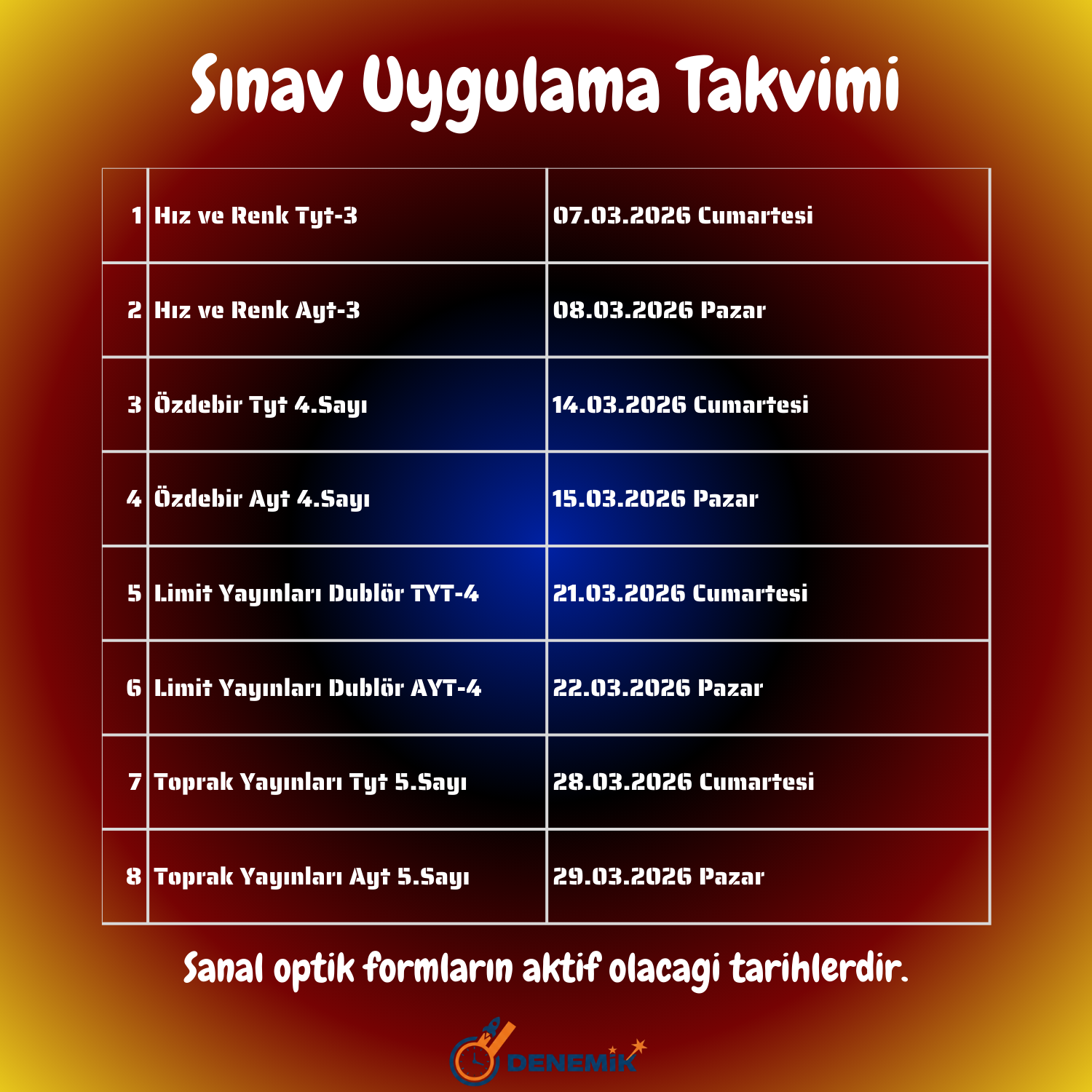 Denemik ile rastgele değil, planlı çalış. Mart ayı sınav takvimini takip et, sanal optik formlar aktif olduğunda sınavını çöz ve başarını analiz et. Hayallerini erteleme, Denemik ile kazanmaya bugünden başla!